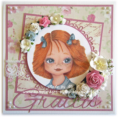 I am not sure from where the dp's are. I found them laying around without any front to the pad. Flowers are a mix from I am Roses and WOC. The leaf punch is from Martha Stewart. Pearls from Bunny Zoes. The sentiment die is from Moa Pyssel. Lace from WOC. The round dies are from Spellbinders and Marianne Design.