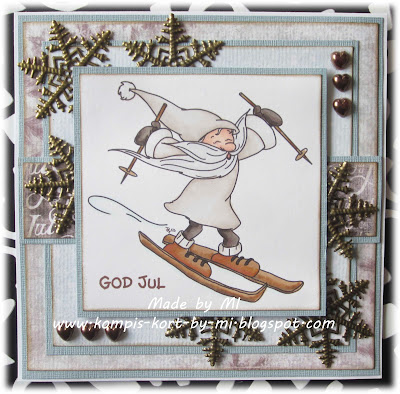 The designer papers are from Panduro, an old paper pad that was quite a good fit to this image. The card design is simple with quite a bunch of layers to add some both texture and fun to the card. I have decorated it with some metal snow flakes and I cut a few of them in the middle. Saving weight and mailing costs. LoL There is also a few brown heart shaped pearls. The stamp is my favourite mini text stamp from Gummiapan I think. I don't have the package left so not totally sure.